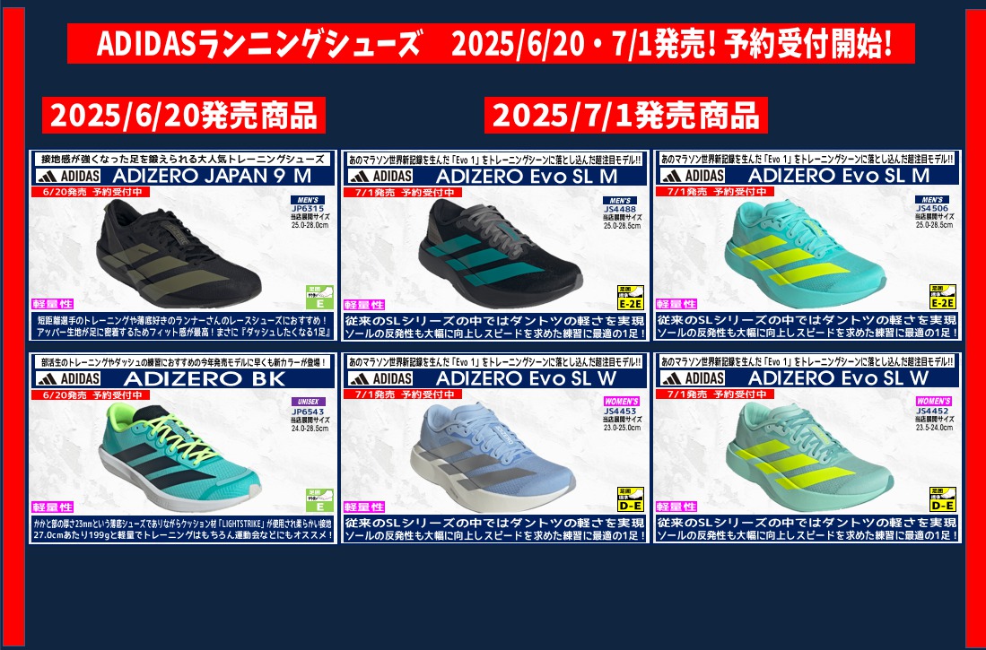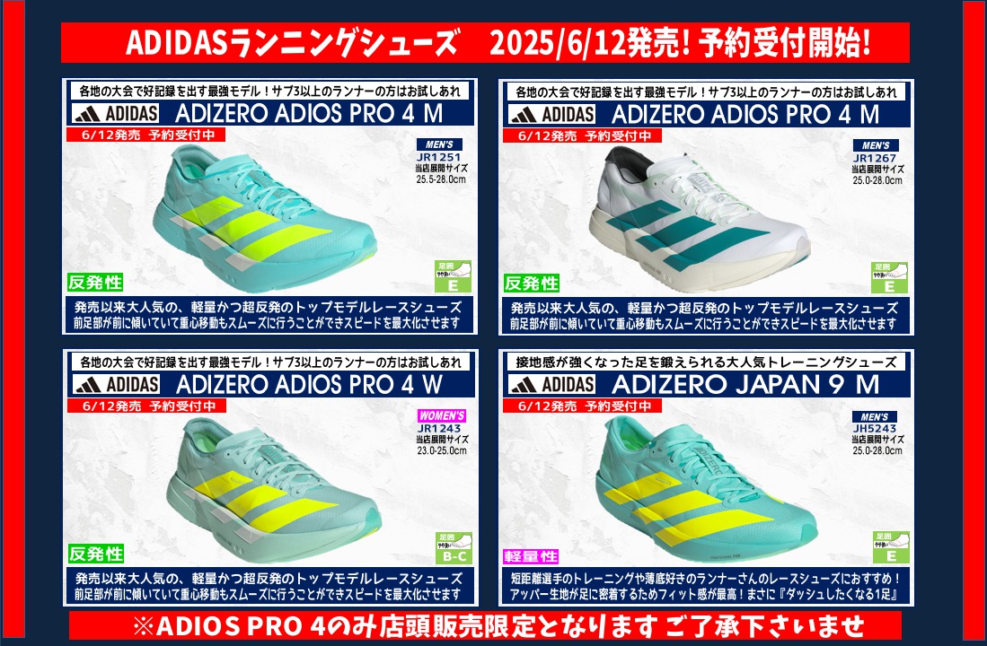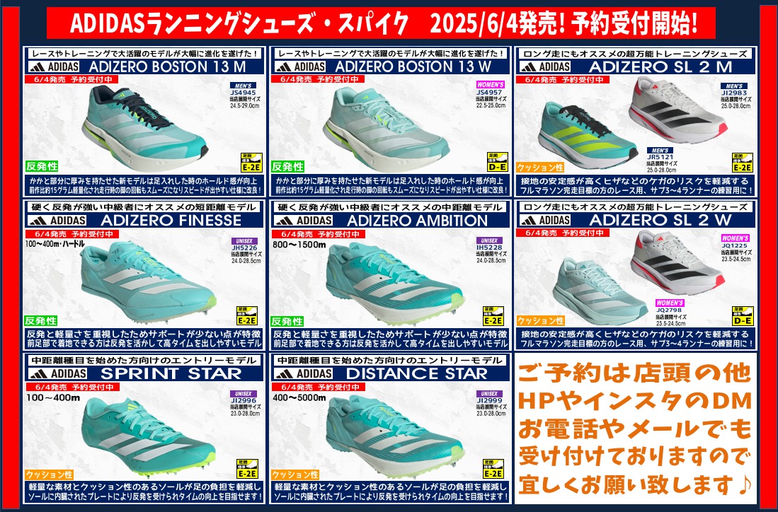【朝霞本店ランニング】ADIDAS 6/4・6/12・6/20・7/1発売!陸上スパイク、ランニングシューズ 予約開始!